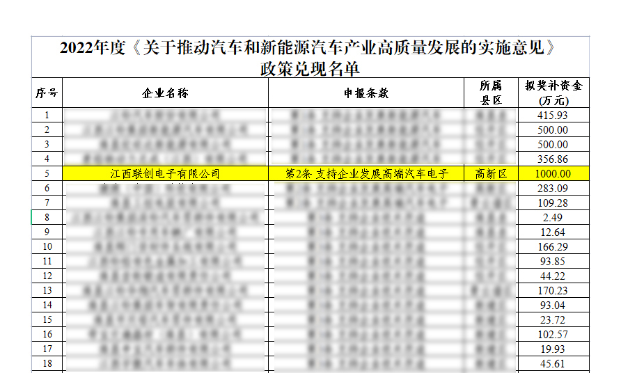 2023年6月,南昌市工信局、财政局联合下发《〈关于推动汽车和新能源汽车产业高质量发展的实施意见〉中有关支持政策的实施细则》的通知,公司项目申报团队准确把握政策要求及有关实施细则规定,积极与南昌高新区管委会、南昌市工信局沟通,根据文件要求收集相关资料组织申报,经各县区工信局主管部门初审推荐、集中复审等程序,最终,江西联创电子成功入选并公示,获得1000万元奖补资金。